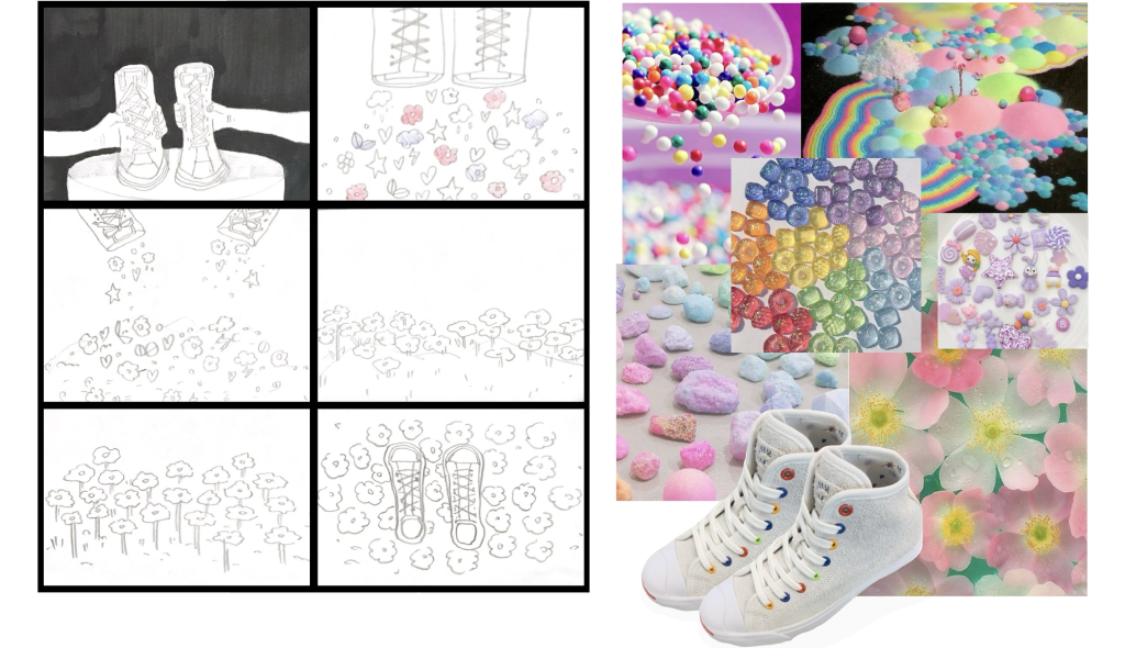 实现方式:以她的标志性可爱美学为核心,延伸至三大视觉载体—— 定制妆容、产品上脚造型、场景化展示素材,通过三者的视觉联动与场景化交织,立体诠释新世代的可爱美学主张。