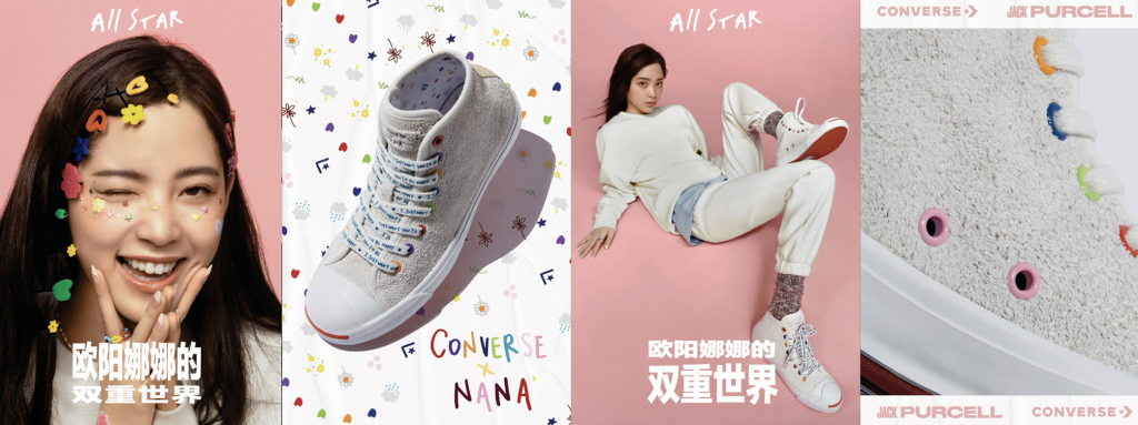 核心创意:欧阳娜娜为 Jack Purcell 打造专属联名设计,以其标志性的可爱手绘符号为起点,将个人美学从图案延伸至全维度宣传场景,实现从 “设计表达” 到 “风格渗透” 的具象化放大。