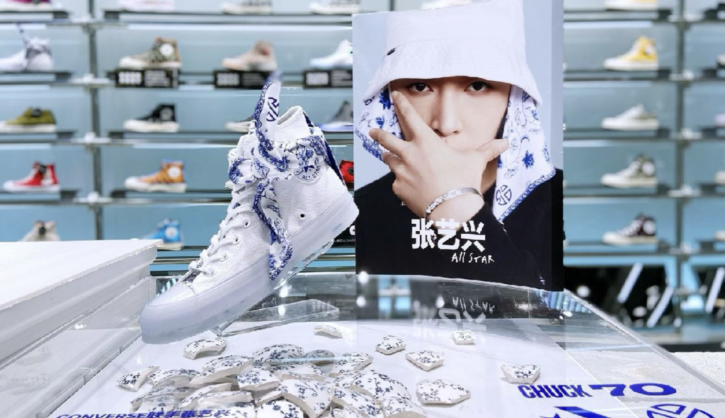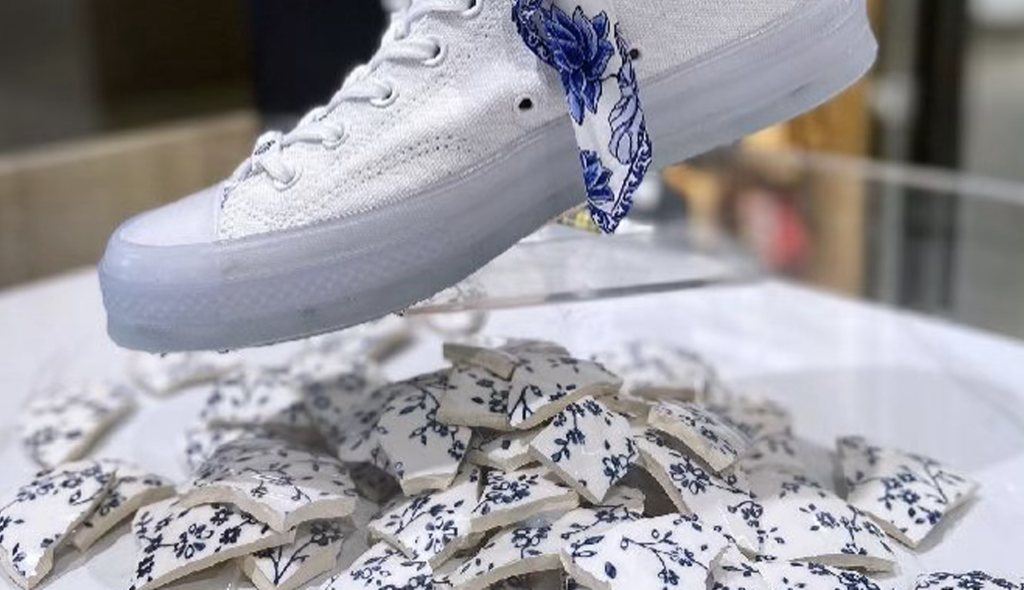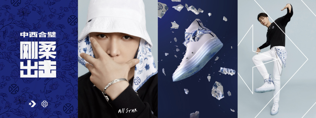 实现方式:以艺术博物馆为叙事场域,通过一只青花瓷鞋从碎裂到重组的视觉演变,呈现联名产品的诞生过程。融入张艺兴充满爆发力的 krump 舞蹈姿态与潮流街舞造型元素,让古典瓷器的含蓄与现代街舞的张扬形成强烈反差,打造极具冲击力的视觉奇观。
